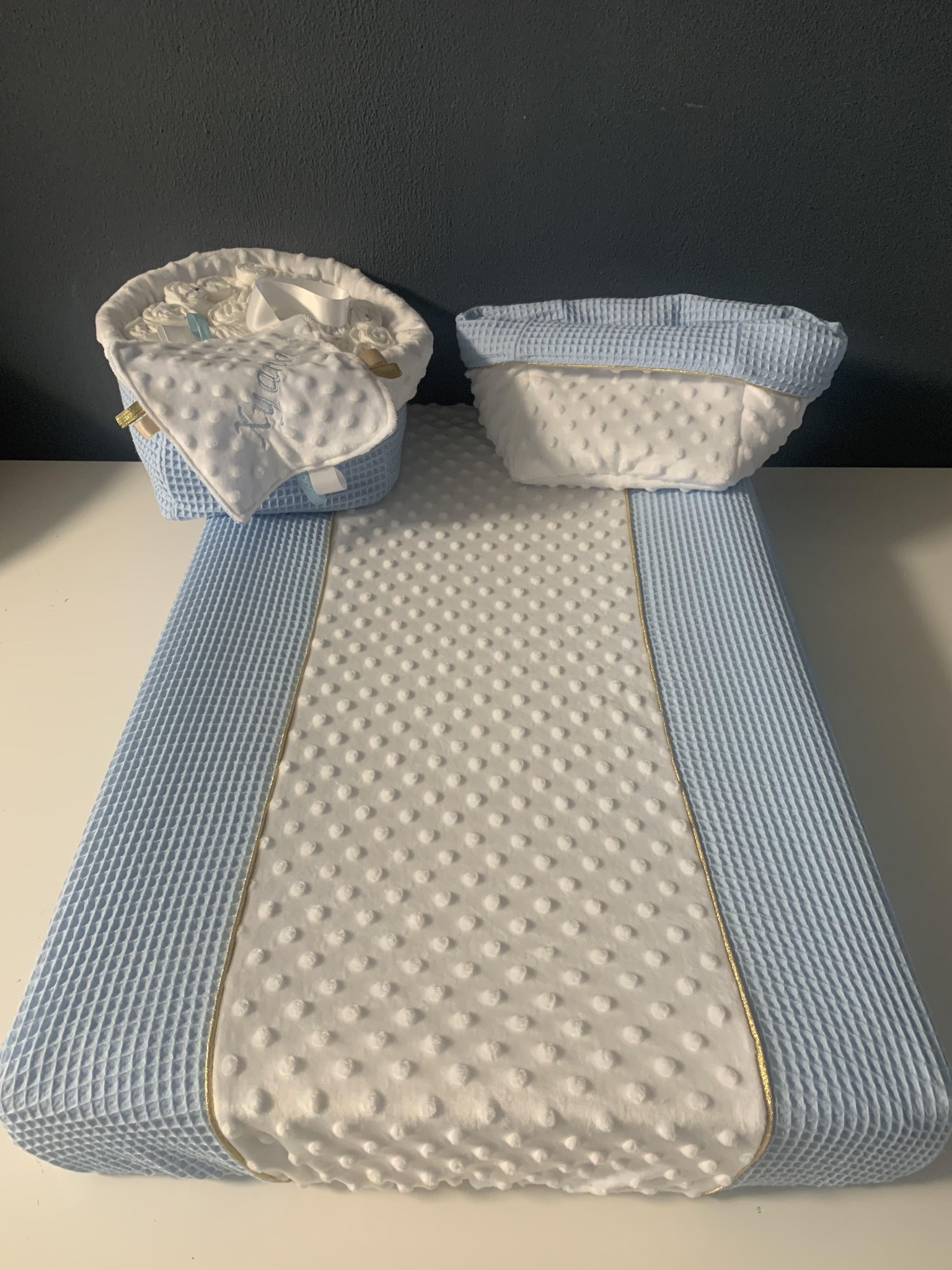 Deze aankleedkussenhoes in babyblauw met witte minky en een subtiel goud randje brengt een vleugje luxe in de babykamer.