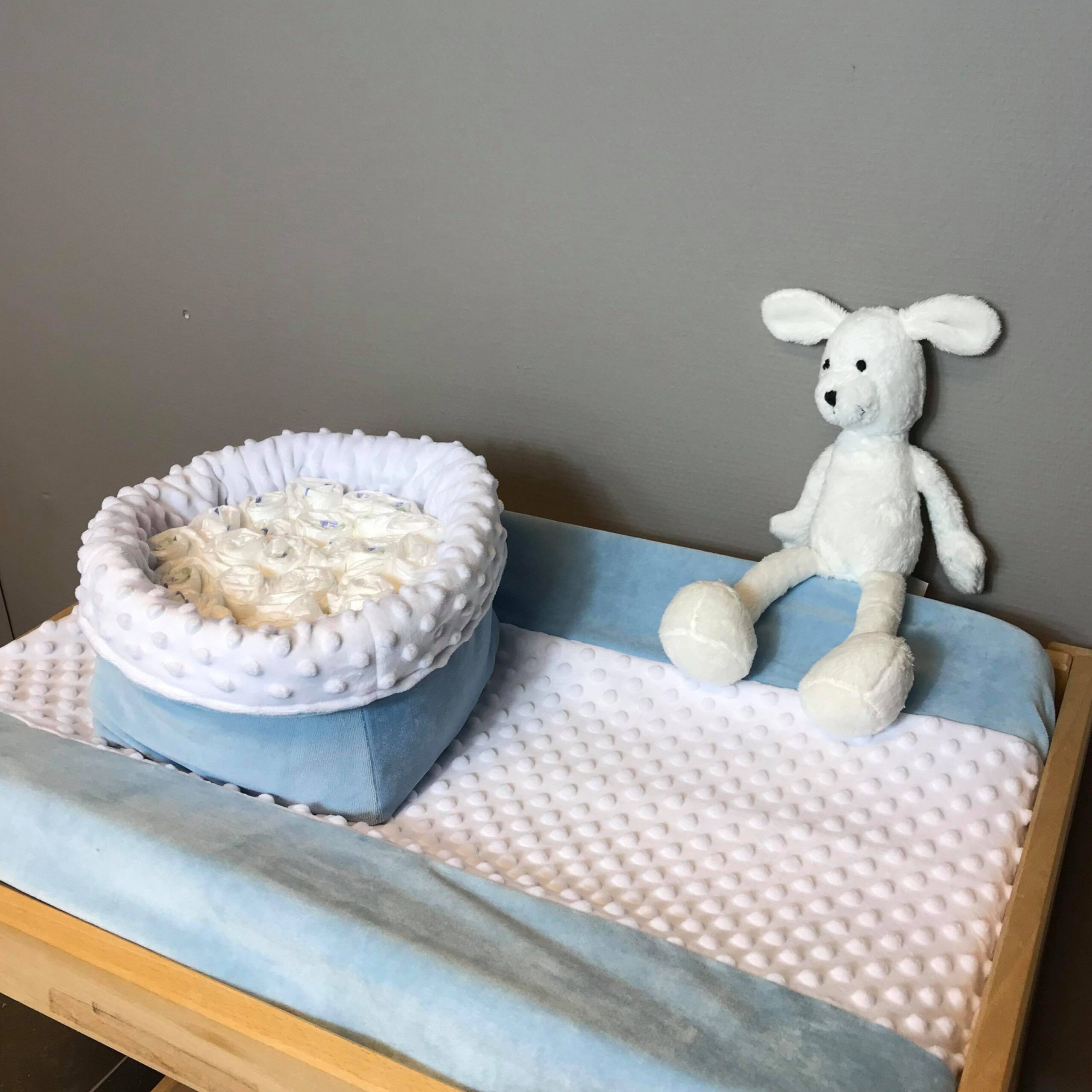Deze hoes is gemaakt van een zachte lichtblauwe nicky velours gecombineerd met een zachte witte minky velours. Allebei superzacht voor een teer babyhuidje.