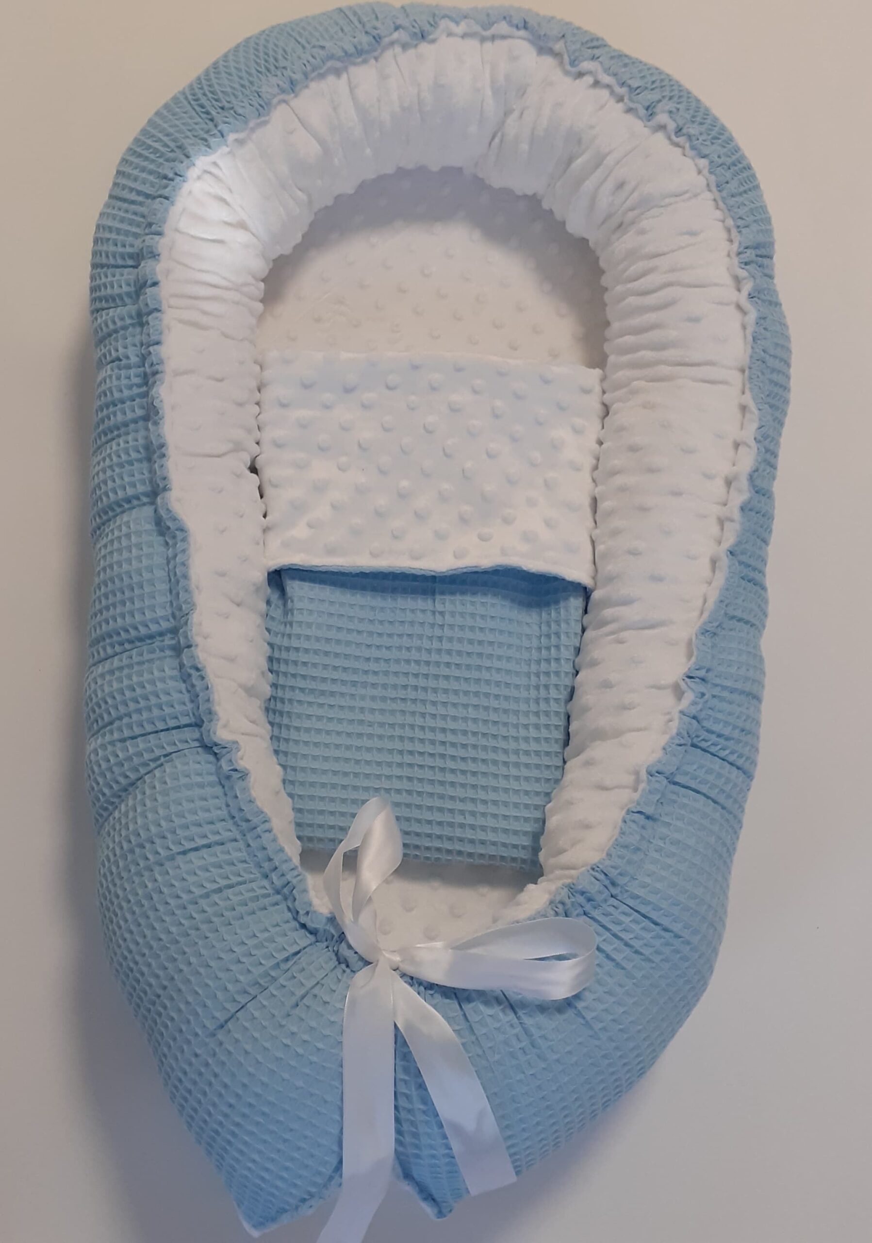 Heerlijk zacht babynestje van babyblauwe kleur wafel met een witte minky velours binnenkant.