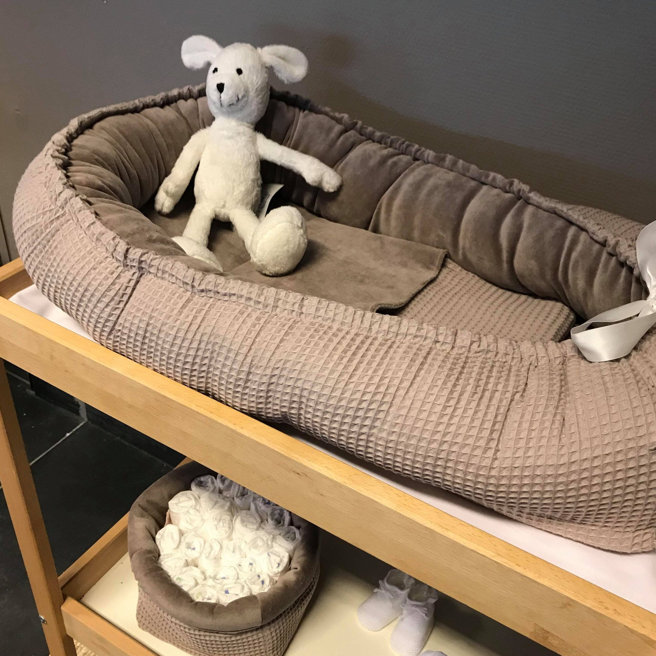 Dit nestje is van een taupe wafelstof met een nicky velours binnenzijde.