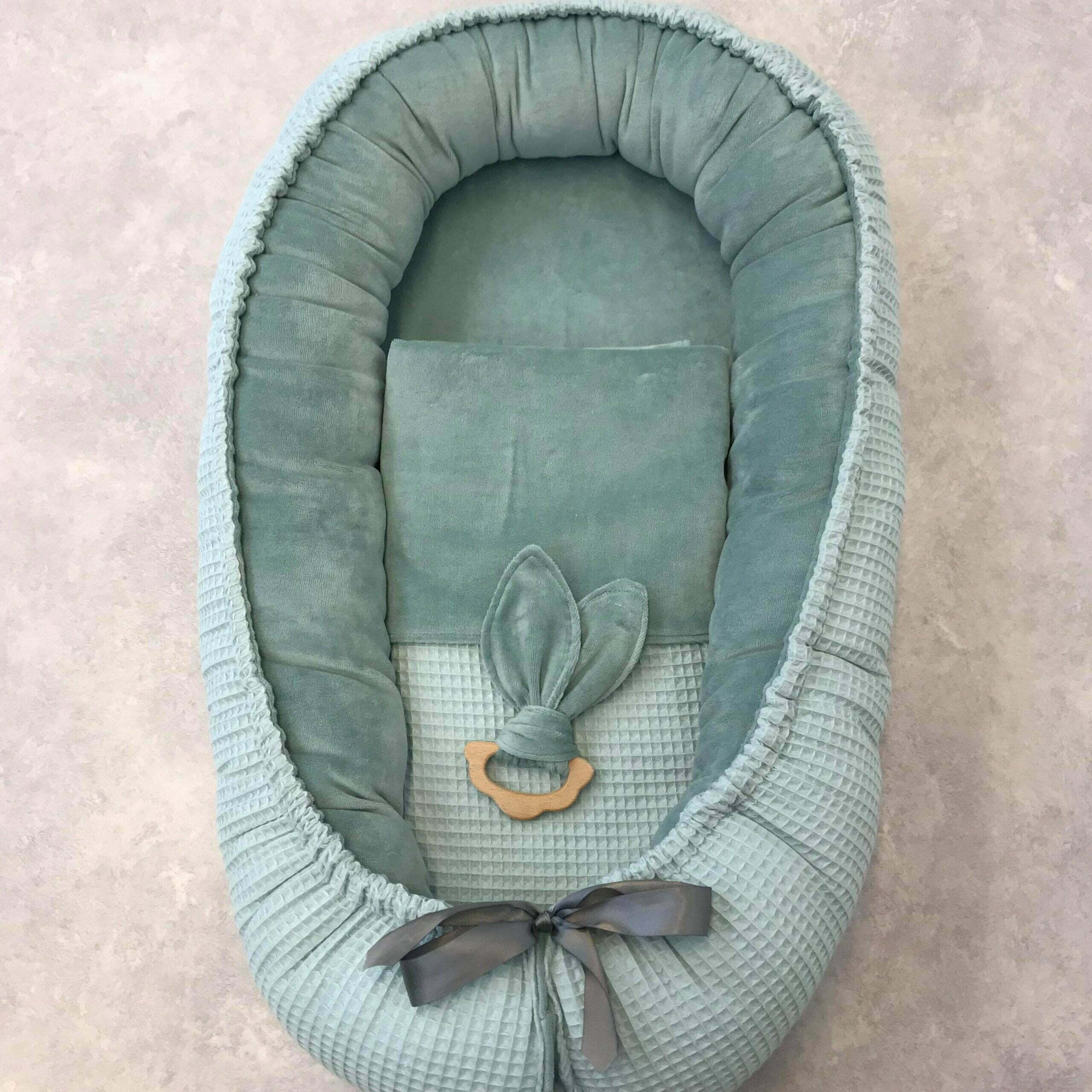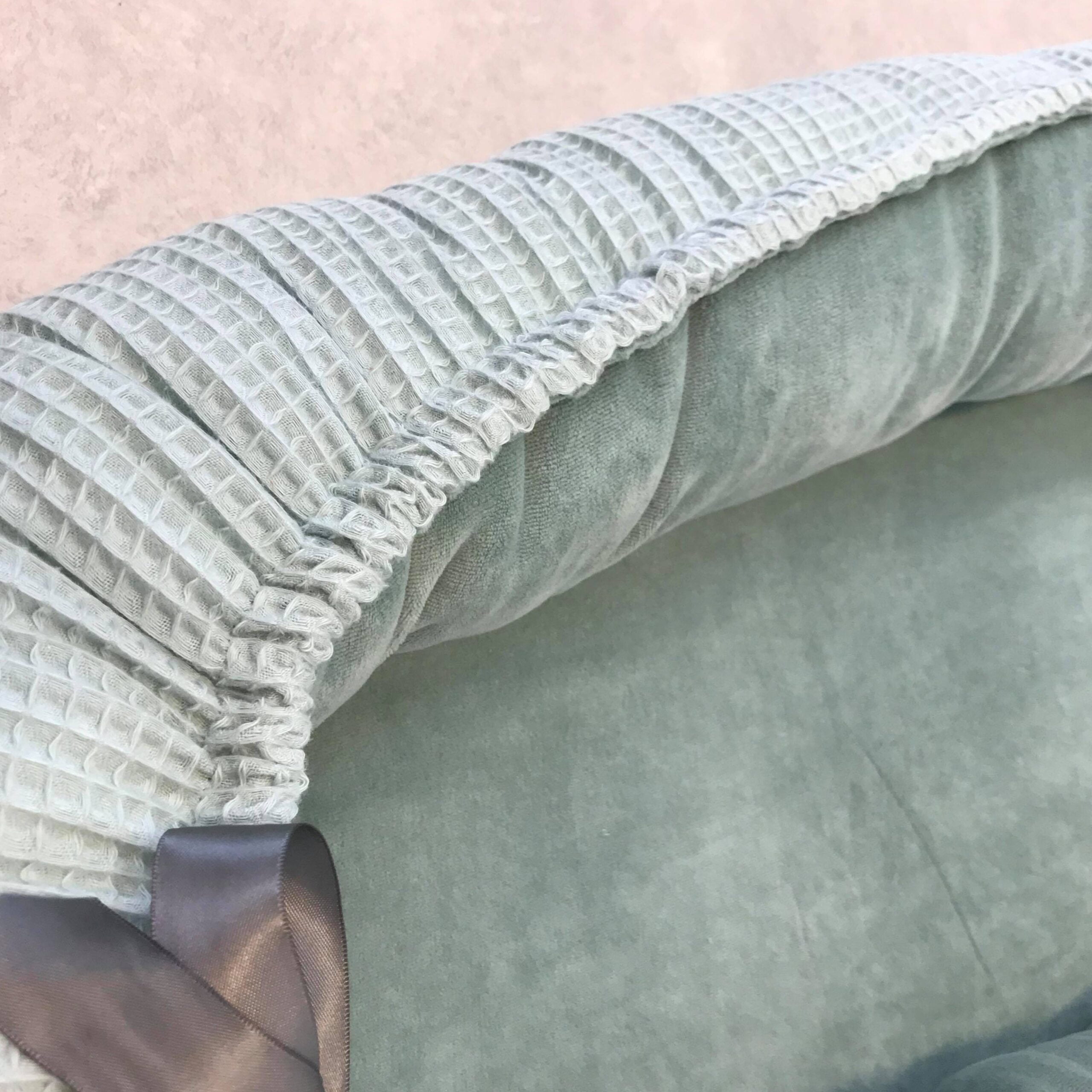 Dit babynestje van Bij Mij is gemaakt van heerlijk zacht groen velours, een stof die warmte en rust uitstraalt.