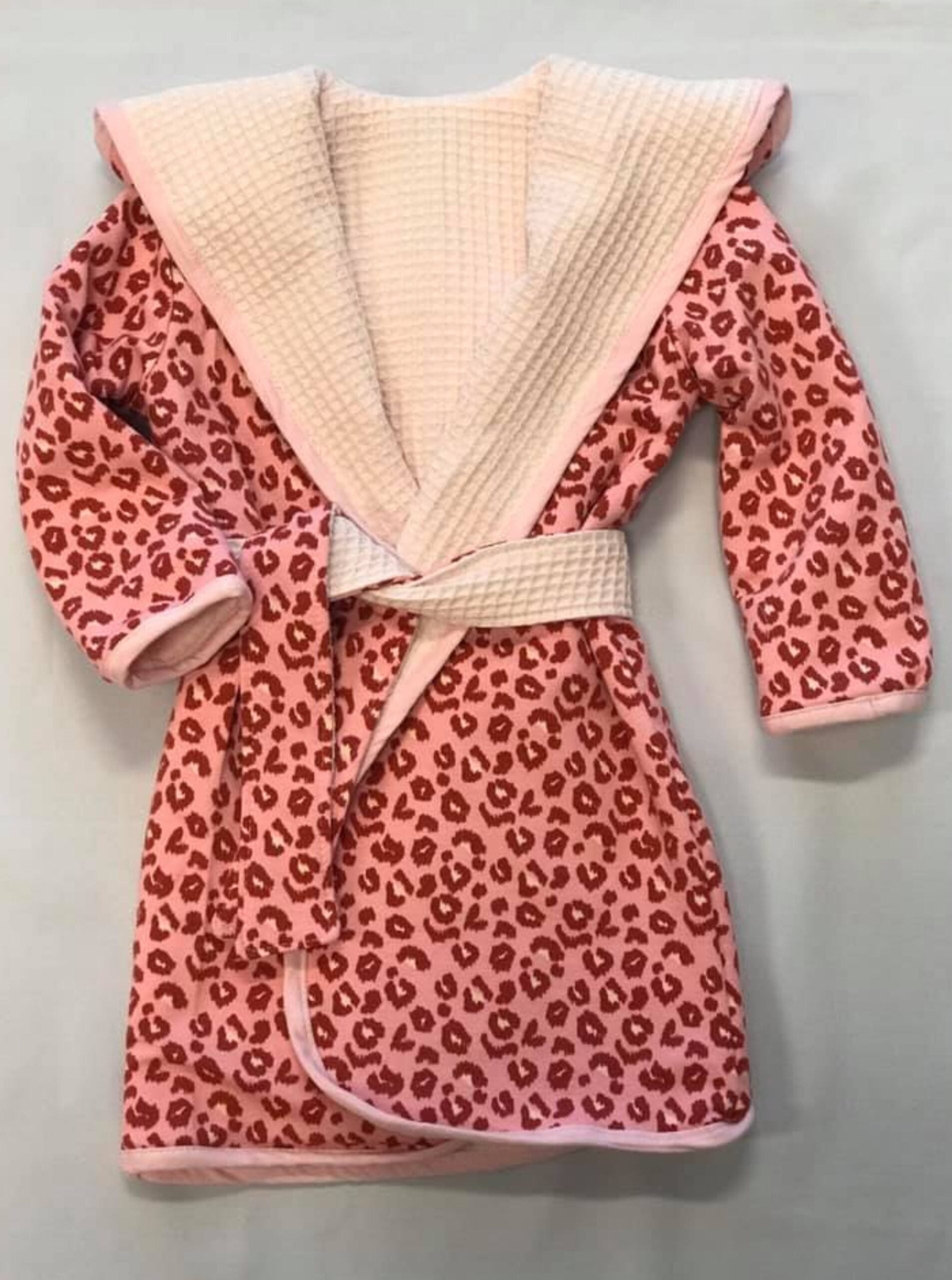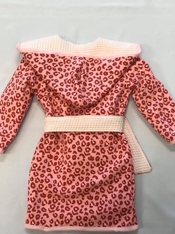 Deze leuke badjes is van lichtroze wafelstof gecombineerd met een stoere hard roze leopard print.  Hij heeft een capuchone, twee zakken aan de voorkant en een ceintuur met lussen.