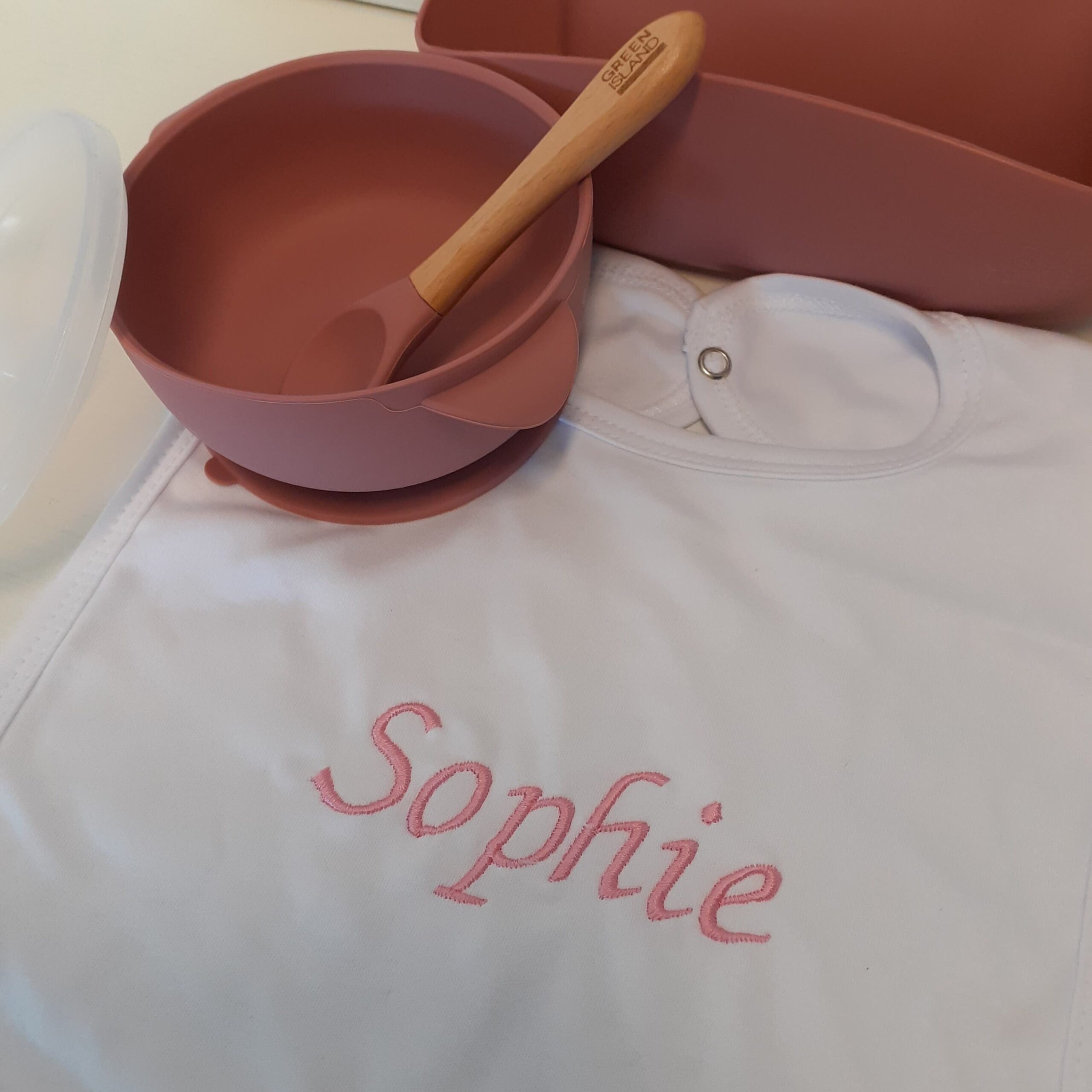 Hoe leuk zijn deze slabbetjes met geborduurde naam. Geen vieze shirts meer na het eten.