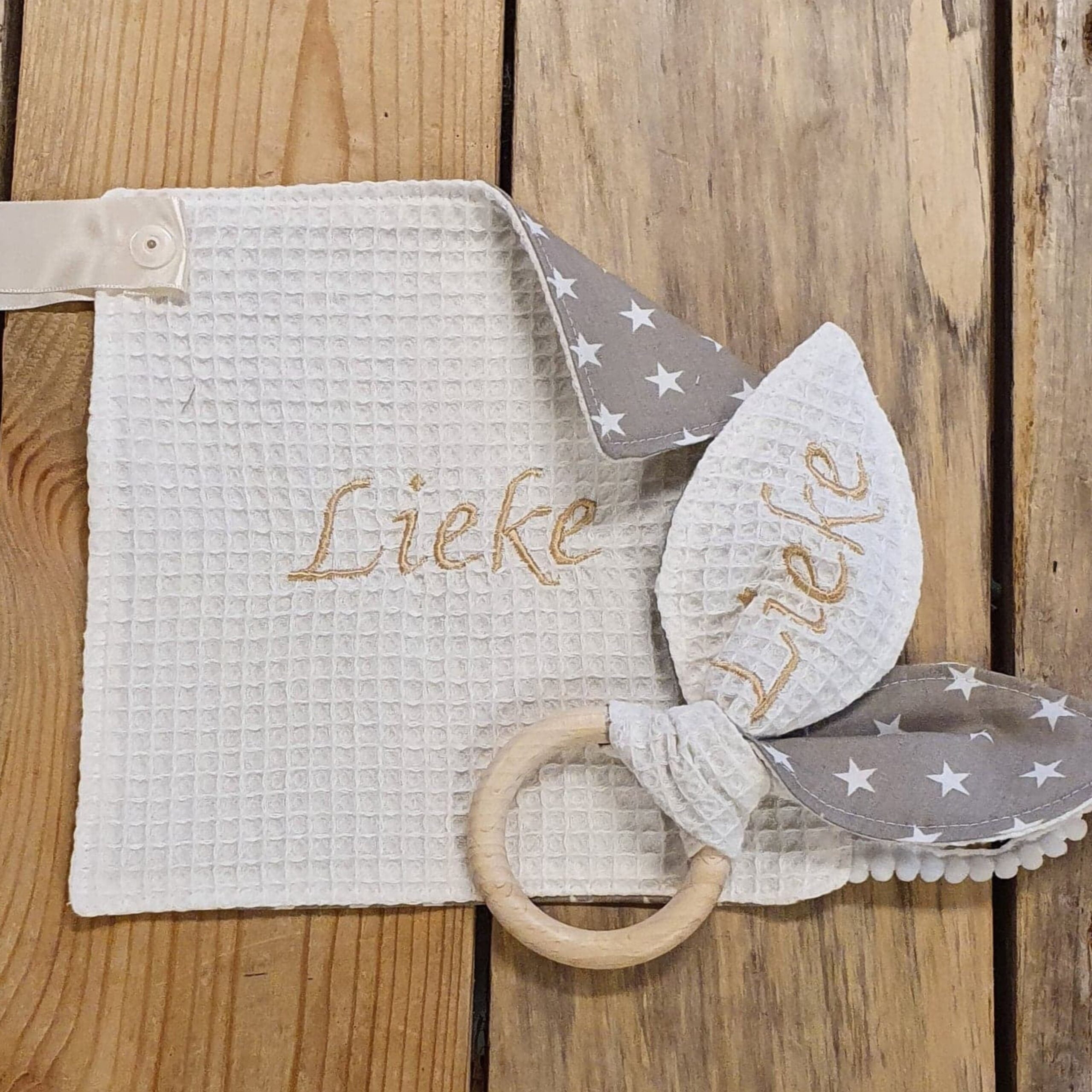 Hoe leuk is deze bijtring met naam. Deze houten ring is van onbehandeld hout zodat je kleine veilig kan sabbelen en bijten. Heeft je kindje last van doorkomende tandjes geeft de houten ring verlichting. TIP! Doe hem een tijdje in de vriezer. De “oortjes” zijn van zacht materiaal geschikt voor de allerkleinste babyhandjes. Bij deze bijtring hoort een speendoekje in dezelfde kleuren.