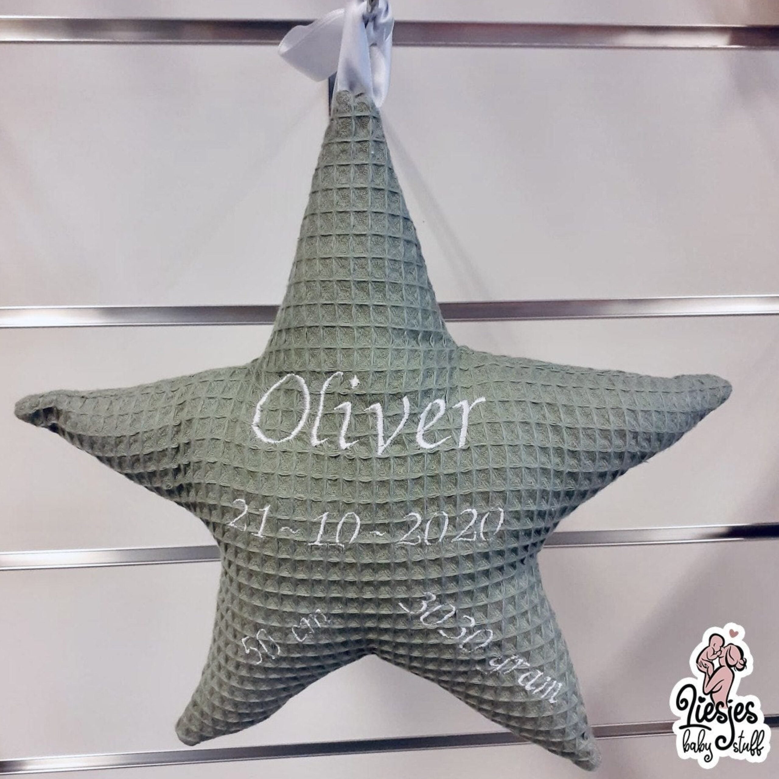 Dit is echt een super cadeau. Een leuke ster van wafelstof met de geboortegegevens van de baby geborduurd. Dus wil je met een origineel geschenk op kraamvisite is dit zeker een aanrader.